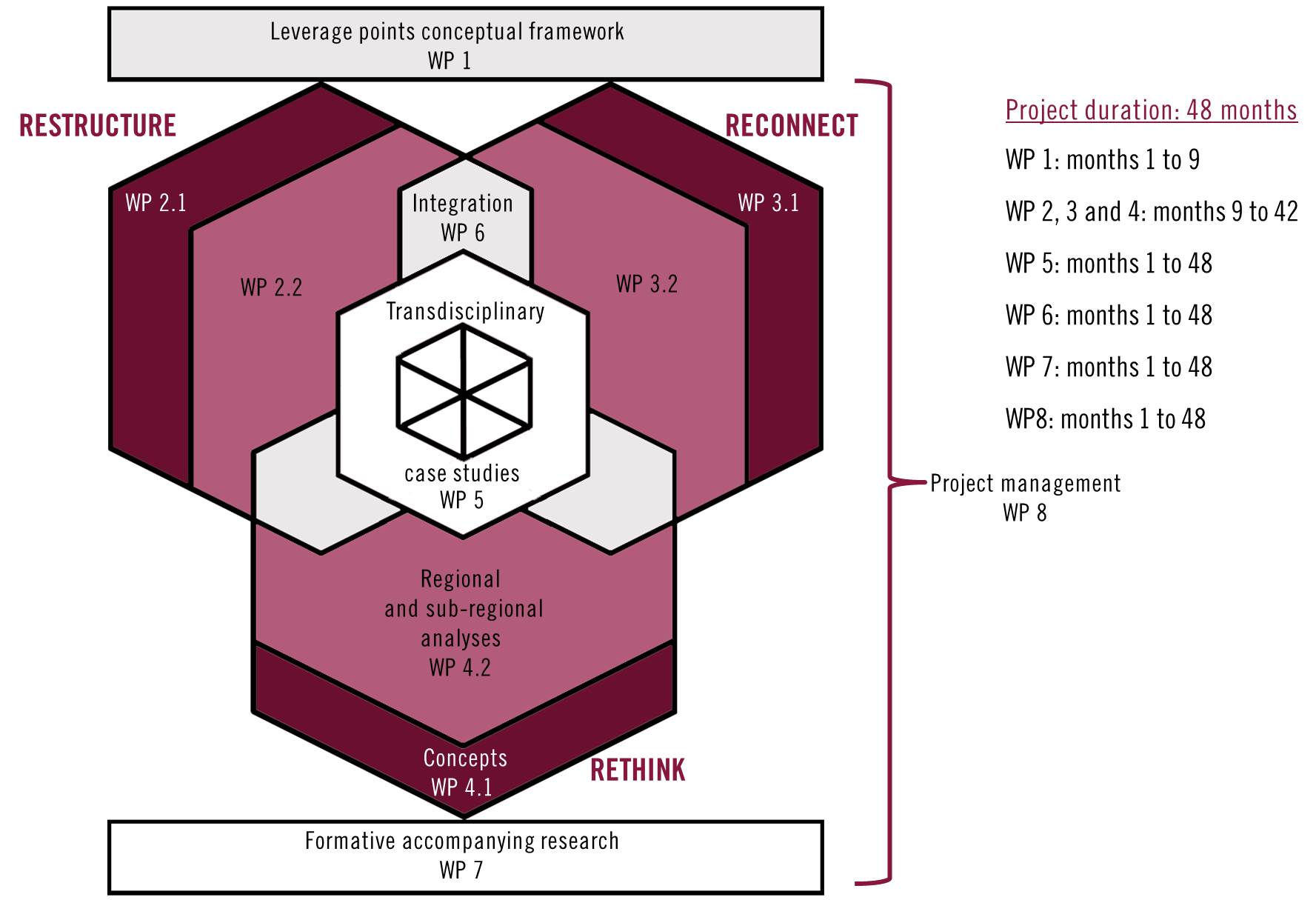 Figure 1. Schematic overview of the work packages and timeline of Leverage Points. The project included a conceptual scale (WP 1; WP 2.1, 3.1, 4.1), a regional, empirical scale (WP 2.2, 3.2, 4.2), and a local, transdisciplinary case study scale (WP 5). Additional work packages were devoted to integration (WP 6), formative accompanying research (WP 7), and project management (WP 8).